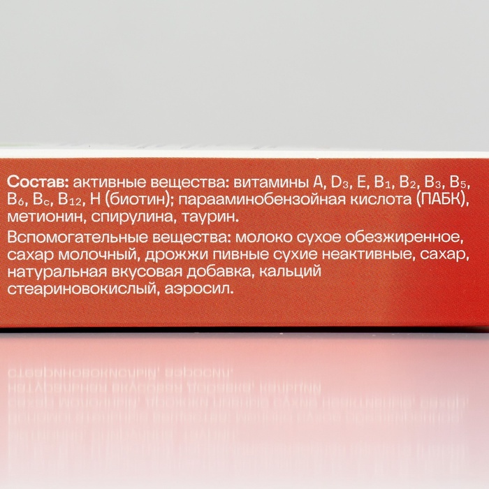 Активные вещества: витамины А, D3, Е, В1, В2, В3, В5, В6, Вс, В12, Н (биотин); парааминобензойная кислота (ПАБК); метионин, таурин, спирулина; дрожжи пивные сухие неактивные; мука рыбная (вкусовая добавка).
