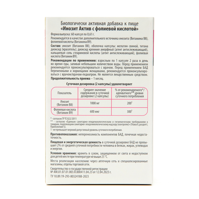 Состав: Инозит (Витамин В8), оболочка капсулы: желатин свиной, титана диоксид (краситель); диоксид кремния аморфный (агент антислеживающий), кальциевая соль стеариновой кислоты (агент антислеживающий), фолиевая кислота (Витамин В9).