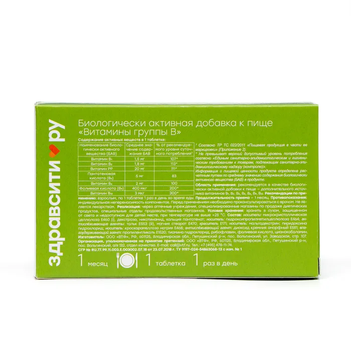 Состав: носители: микрокристаллическая целлюлоза E460(i), декстроза; никотинамид, кальция пантотенат; носитель: гидроксипропилметилцеллюлоза Е464; антислёживающие агенты: тальк Е553(iii), магния стеарат Е470; краситель Е171; носитель: мальтодекстрин, пиридоксина гидрохлорид; носитель: кроскарамеллоза натрия Е468; антислёживающий агент: диоксид кремния аморфный Е551; влагоудерживающий агент: пропиленгликоль Е1520; тиамина гидрохлорид, рибофлавин, фолиевая кислота, цианокобаламин.