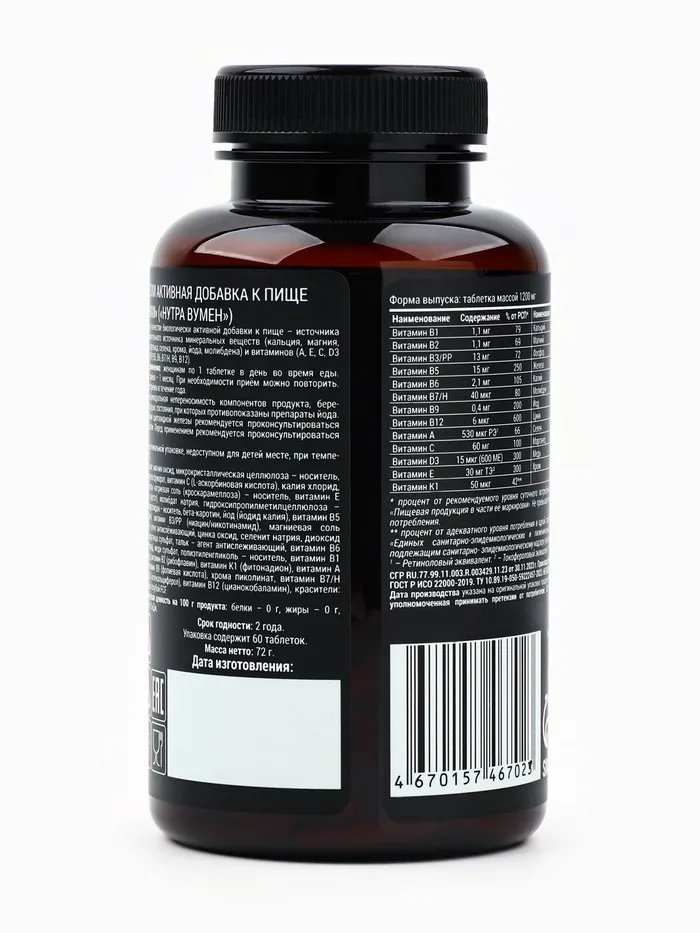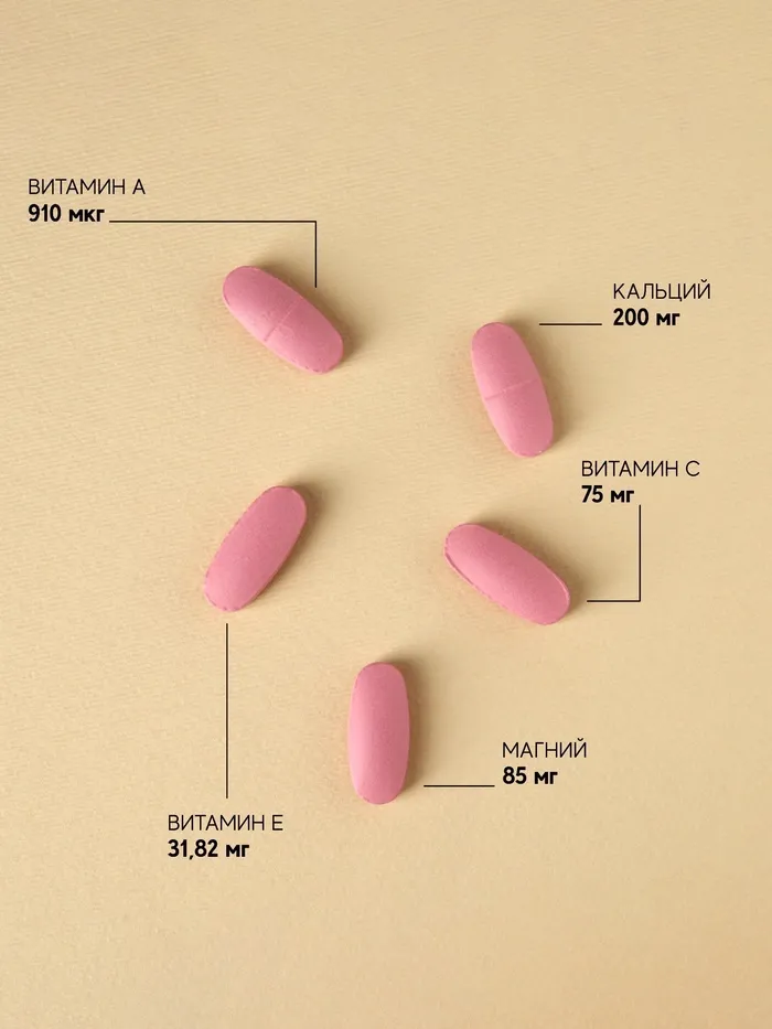 Состав: карбонат кальция, микрокристалическая целлюлоза - носитель, хлорид калия, оксид магния, токофорелла ацетат, фосфат кальция, аскорбиновая кислота, поливинилпирроопидон - загуститель, фуарат железа, крахмал, обработанный щелочью - стабилизатор, D- пантотенов кальция, ниацинамид, магневая соль стеариновой кислоты - эмульгатор, покрытие таблетки (гидроксипропилметилцеллюлоза, диоксид титана - краситель, тальк - агент антислеживающий, полиэтиленгликоль - глазировать, кармины - краситель, синий блестящий FCF - краситель), ретинола ацетат, сульфат меди, оксид цинка, сульфат марганца, холекальциферол, хлорид хрома, фолиевая кислота, селенит натрия, пиридоксина гидрохлорид, диоксид кремния, тиамина мононитрат, рибофлавин, йодид калия, биотин, цианокобаламин, фиплохинон, молибден натрия, метаванадат натрия.