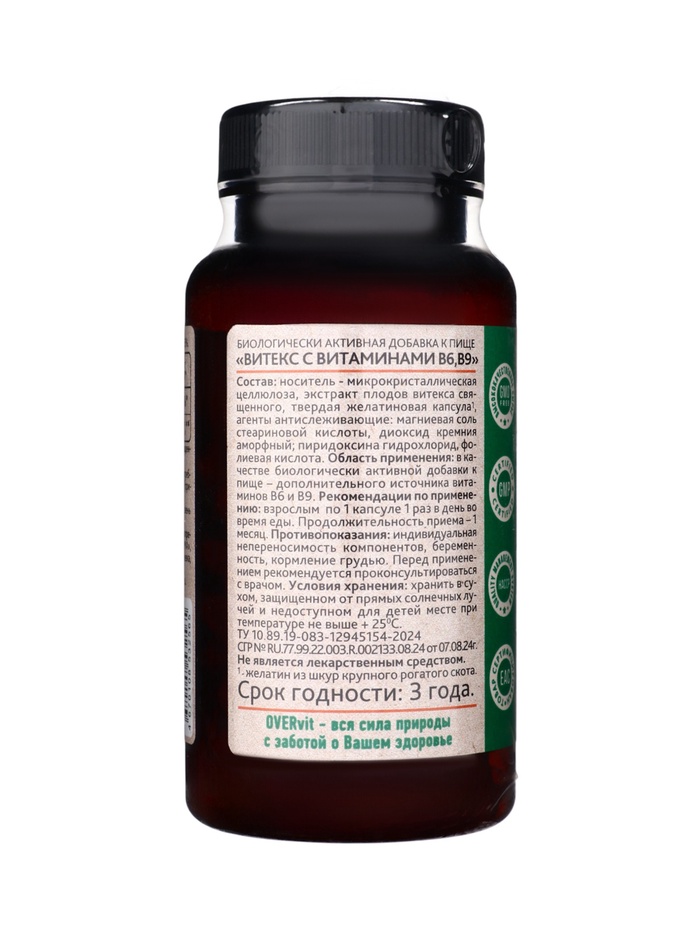 Витекс с витаминами В6, В9 OVERvit, для женского здоровья, 60 капсул — Характеристики