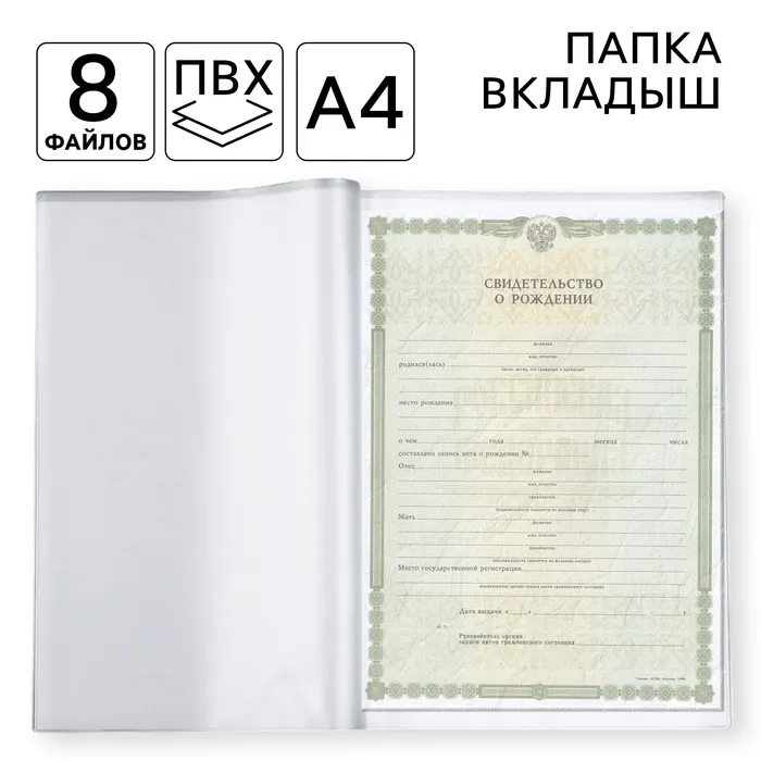 Вкладыш ПВХ, 8 файлов А4, обложки на документы — Характеристики