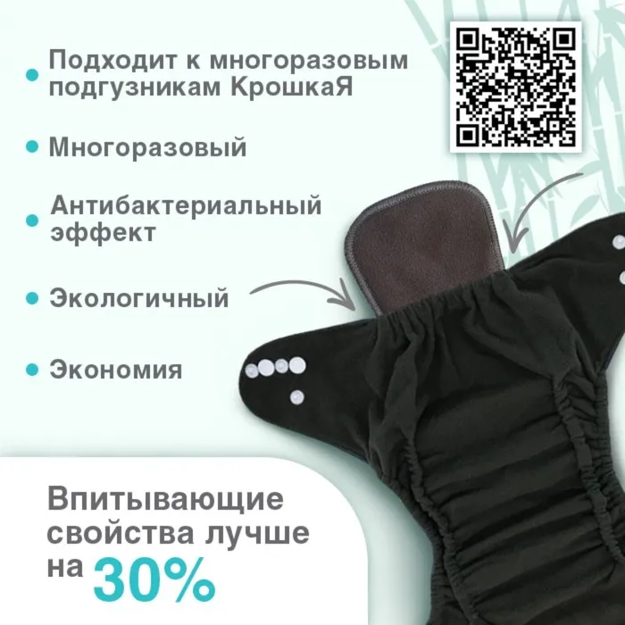 Поддержание личной гигиены является важной и необходимой частью ежедневного ухода за любимой крохой. Вкладыш в многоразовый подгузник — это именно та вещь, которая поможет родителям заботиться о ребёнке, чтобы он всегда оставался чистым и здоровым. Изделие создано из бамбукового волокна, что обеспечивает лучшее впитывание.