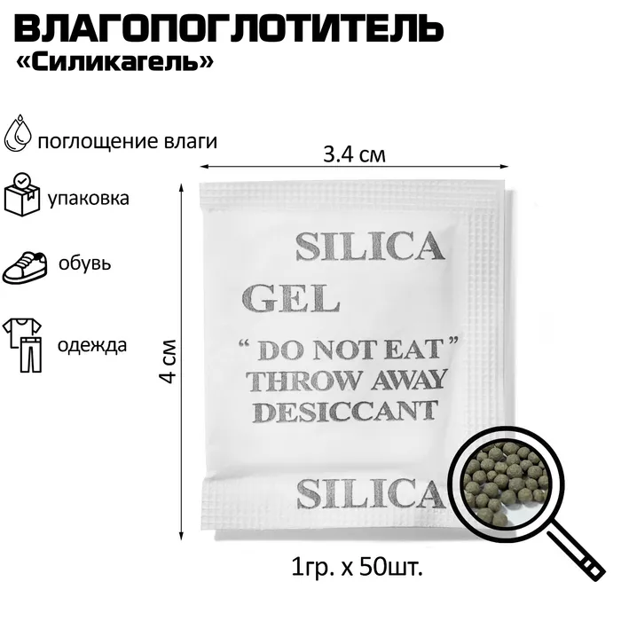 Влагопоглотитель «Силикагель» в гранулах – это эффективное средство для поглощения избыточной влаги. Набор из 50 шт. идеально подходит для сохранения сухости и защиты предметов от сырости, плесени и коррозии.