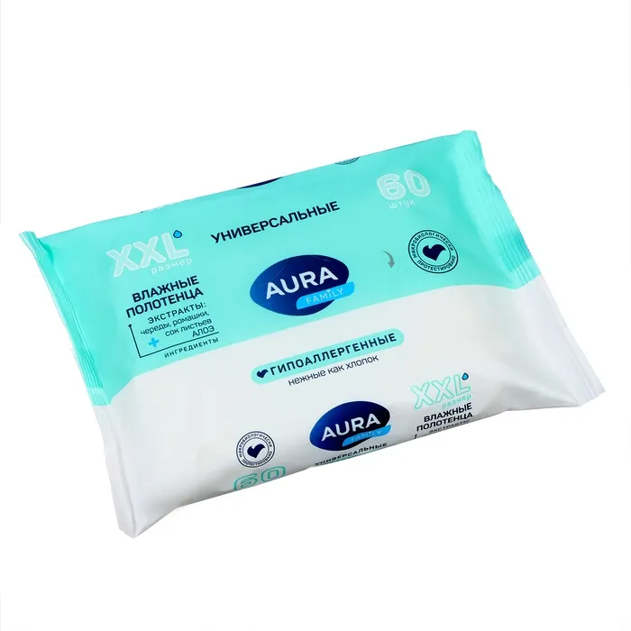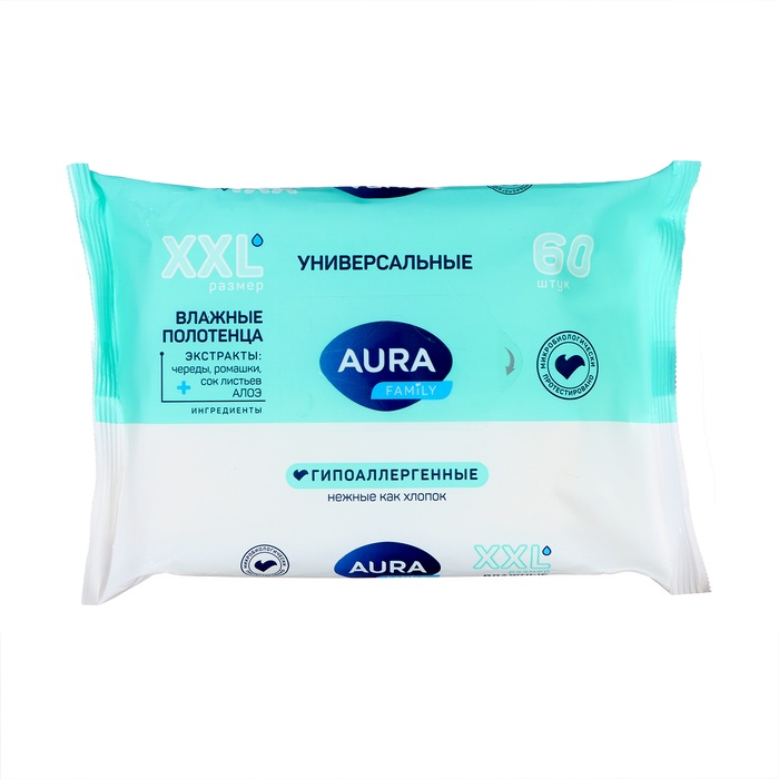 Универсальные влажные полотенца AURA Family созданы для всей семьи для ежедневного использования. Гипоаллергенные полотенца деликатно очищают и подходят для самой чувствительной кожи. В составе лосьона присутствуют экстракт череды и ромашки, которые оказывают противовоспалительный эффект. Также в составе содержится витамин Е, способствующий восстановлению кожи, и сок листьев алоэ, увлажняющий и защищающий от агрессивного воздействия солнечных лучей. Влажные полотенца не содержат в составе этиловый спирт и микробиологически протестированы.