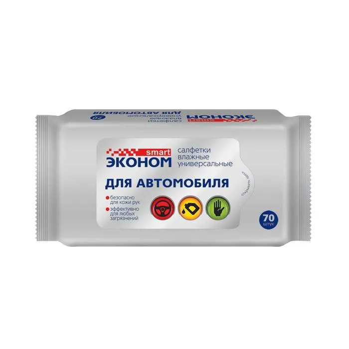 Салфетки влажные Smart Эконом универсальные для автомобиля 70шт созданы, чтобы обеспечить качественную уборку внутри салона автомобиля. Салфетки изготовлены из мягкого и экологичного нетканого полотна и пропитаны очищающим лосьоном, который в упаковке из плотного полиэтилена долгое время остается активным. Салфетки отлично очищают пластиковые поверхности от грязи и пыли, восстанавливают их оригинальный цвет, не оставляют разводов и обеспечивают долговременный антистатический эффект. Кроме того, салфетки эффективно очищают кожу рук от различных технических загрязнений, таких как бензин, мазут, машинное масло, копоть. Они не раздражают кожу рук и не оставляют чувства липкости после использования.