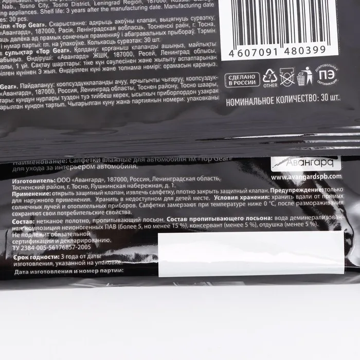 Влажные салфетки Top Gear, для салона автомобиля, 30 шт. — Характеристики