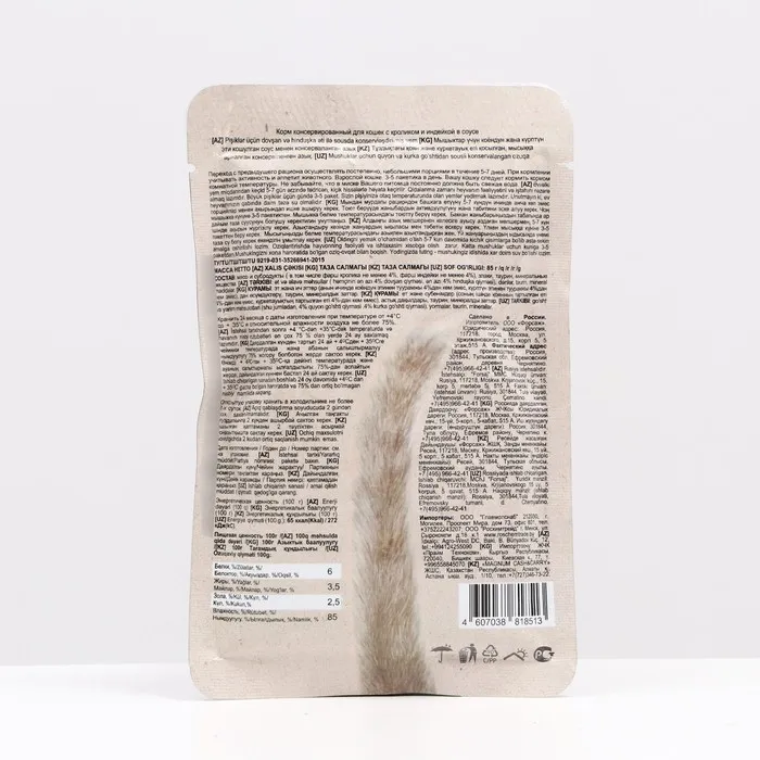 Влажный корм Chammy для кошек, кролик/индейка в соусе, пауч, 85 г — Характеристики