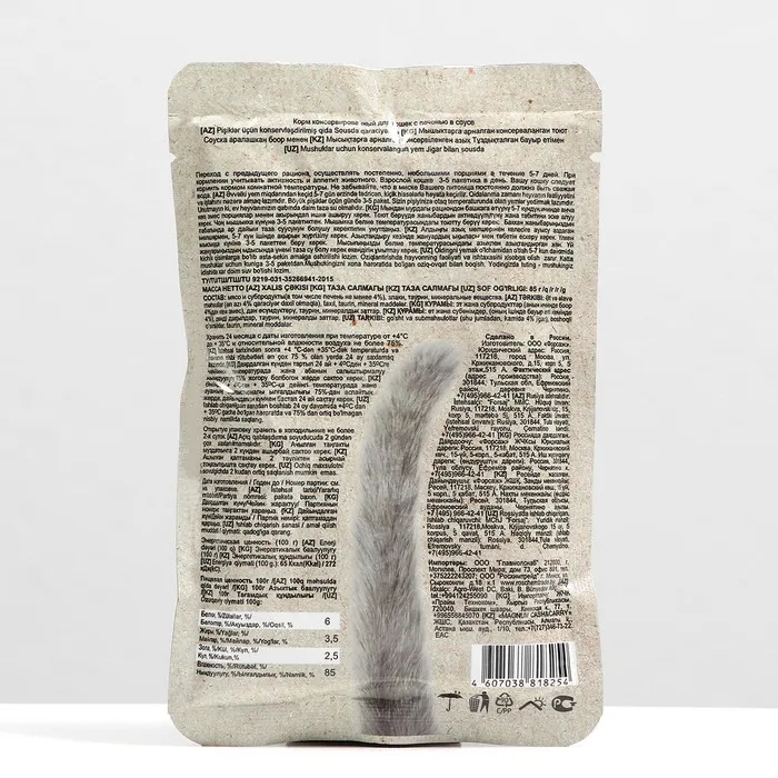 Состав: мясо и субпродукты (в том числе печень не менее 4%), злак, таурин, минеральные вещества.