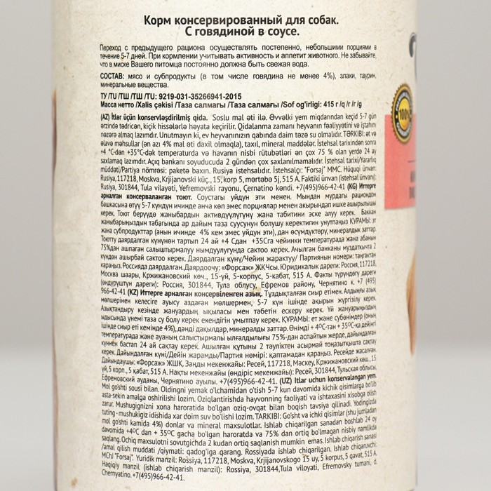 Корм консервированный для собак. С говядиной в соусе.