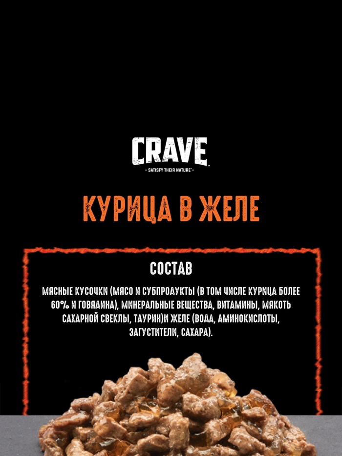Влажный корм CRAVE для взрослых кошек, содержащий минимум 99% ингредиентов животного происхождения, вдохновлен естественным рационом кошки. Ингредиент № 1 в нем — настоящее мясо. Это придает питомцу энергию, насыщает белком и поддерживает организм в тонусе.