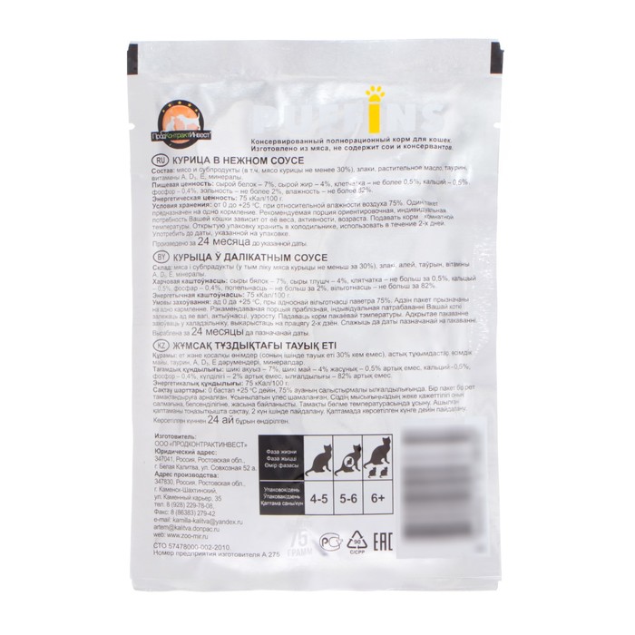 Влажный корм для кошек Puffins, курица в соусе, 75 г — Характеристики