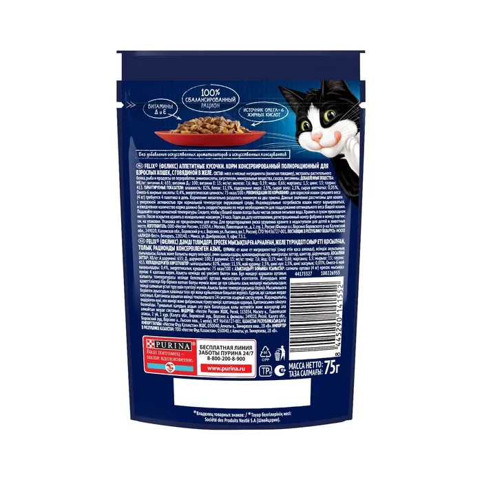 Влажный корм Felix Аппетитные кусочки для кошек, говядина в желе, пауч 75 г — Характеристики