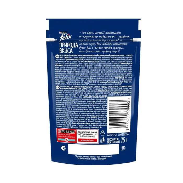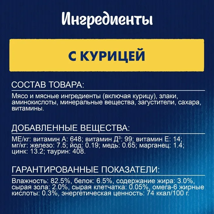 Состав: мясо и мясные ингредиенты (включая курицу), злаки, аминокислоты, минеральные вещества, загустители, сахара, витамины.
