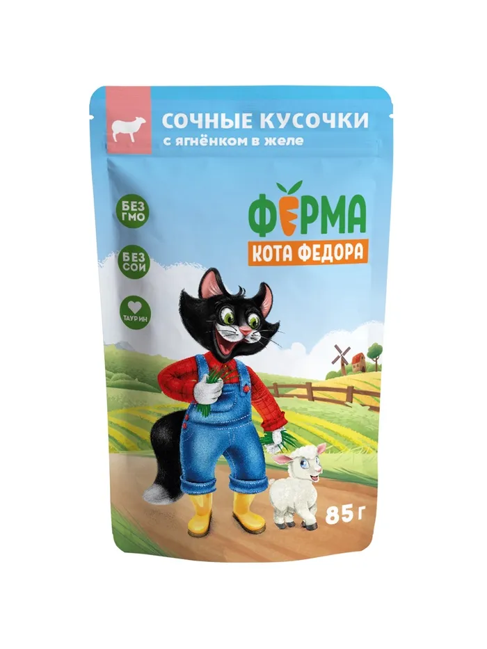 Влажный корм Ферма кота Фёдора сочные кусочки в желе для кошек с ягненком 85г — Характеристики