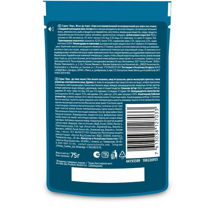 Корм для взрослых кошек «Перл Желе Де-Люкс» — это аккуратно нарезанное и бережно приготовленное филе с курицей, говядиной или лососем в роскошном желе. Корм для кошек от Гурмэ® полнорационный, содержит все необходимые для здоровья микронутриенты. Влажный корм с богатой вкусовой палитрой не оставит равнодушным Вашего взыскательного гурмана.