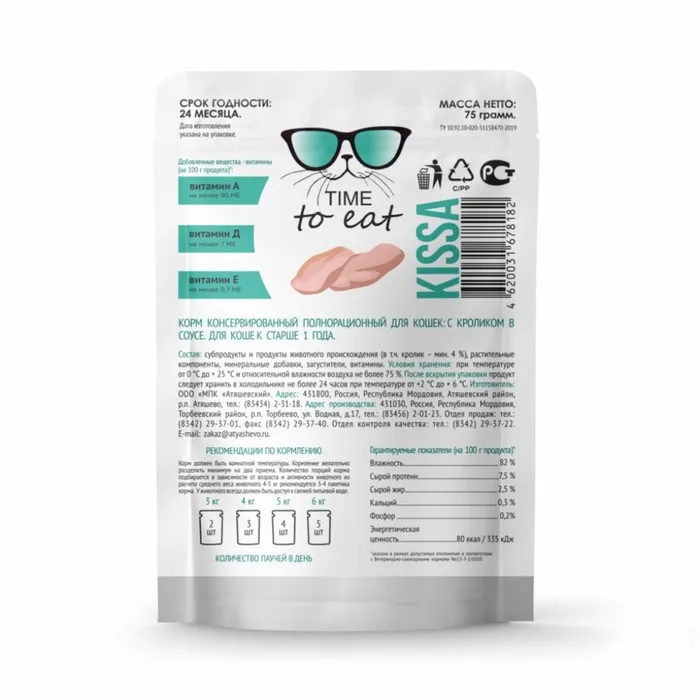 Состав: субпродукты и продукты животного происхождения (в т.ч. кролик – мин. 4 %), растительные компоненты, минеральные добавки, загустители, витамины.