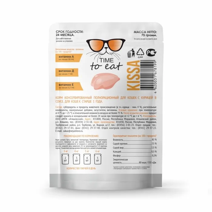 Корм консервированный полнорационный для кошек: с курицей в соусе. Для кошек старше 1 года.