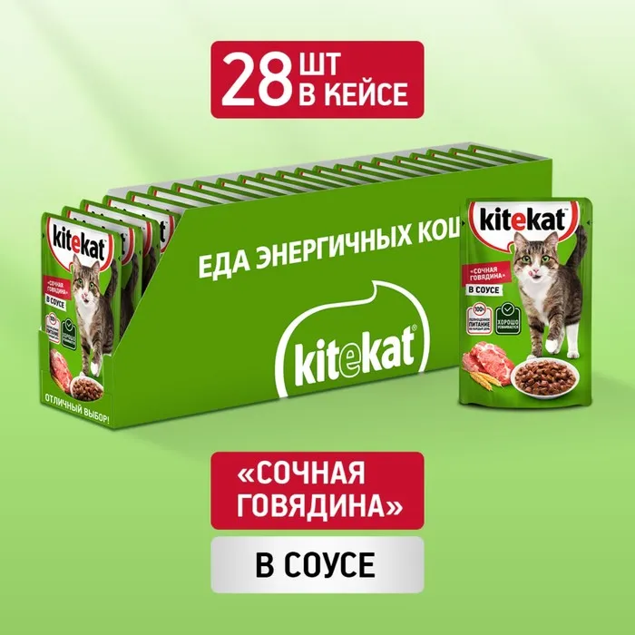 Kitekat™ «Сочная говядина в соусе» — полноценное питание для кошек на каждый день. Текстура соуса придает особенно сочный вкус кусочкам говядины. Корм Kitekat™ создан из высококачественных ингредиентов и содержит все необходимые для здоровья питомца полезные элементы — белки, жиры, витамины (D3, B5, B6, и др.), минералы (кальций, фосфор, магний и др.), таурин, полезные жиры и масла — в правильном соотношении, подобранном профессионалами. За счет клетчатки корм поддерживает здоровье пищеварительной системы, а благодаря сбалансированному составу — подходит и для стерилизованных кошек. Для оптимального контроля веса питомца и заботы о здоровье его ротовой полости рекомендуется сочетать влажный корм с сухими рационами Kitekat™.