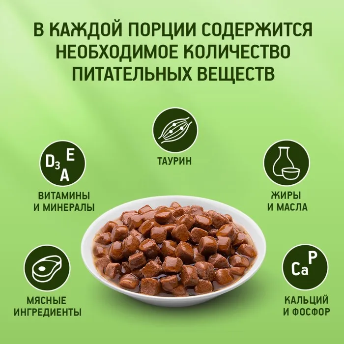 Для взрослой кошки среднего веса (4 кг) требуется 3 - 4 упаковки в день. Вашу кошку следует кормить кормом комнатной температуры. После вскрытия упаковку хранить при температуре от +2 °С до +8 °С, использовать в течение суток.