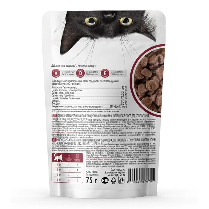 Корм консервированный полнорационный для кошек: с говядиной в соусе. Для кошек старше 1 года.