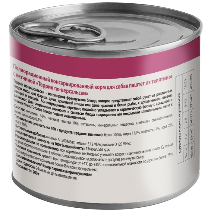 • Банка 200 г — одна порция, одна цель: Объём рассчитан на одно полноценное кормление средней собаки. Удобно использовать для точного контроля порции, не оставляя лишнего.