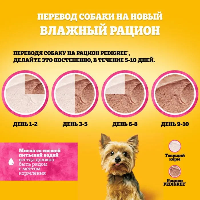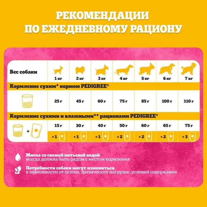 Бренд PEDIGREE® рекомендует сочетать разные форматы корма в рационе Вашей собаки. Утром и вечером Вашему питомцу нужно давать влажный рацион, а в течение дня — сухой. Это позволит объединить преимущества каждого из форматов, ведь ее рацион должен быть не только вкусным, но и тщательно сбалансированным.