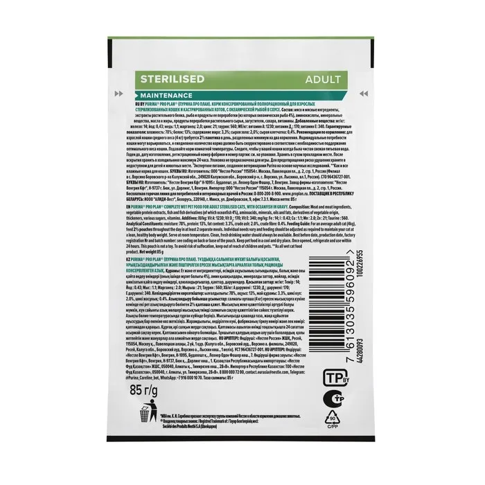 Рекомендации по приготовлению/использованию: Для взрослой кошки среднего веса (4 кг) требуется 3 пакетика в день, разделенных минимум на 2 кормления. Индивидуальные потребности кошки могут варьироваться, и ежедневное количество корма должно быть скорректировано в соответствии с необходимостью поддержания оптимального веса кошки. Подавайте корм комнатной температуры. Следите, чтобы у вашей кошки всегда была чистая свежая питьевая вода.