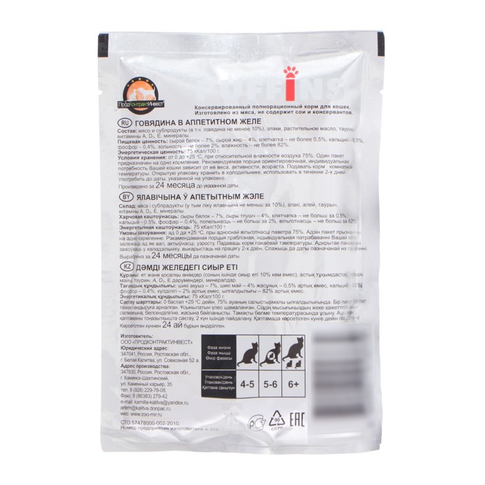 Влажный корм Puffins для кошек, говядина в желе, 75 г — Характеристики