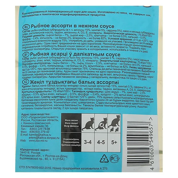 Влажный корм "Puffins" для кошек, сочные кусочки рыбное ассорти в соусе, 100 г — Характеристики