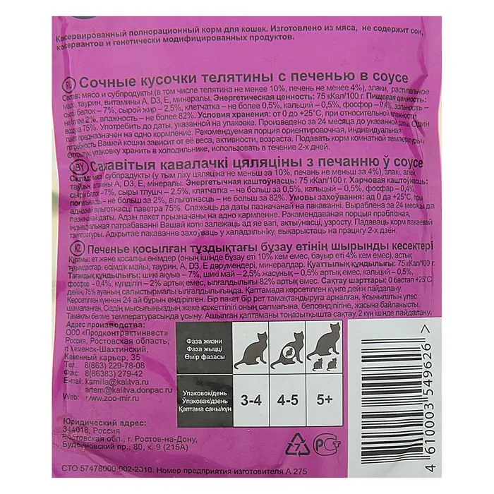 Влажный корм "Puffins" для кошек, сочные кусочки телятина с печенью в соусе, 100 г — Характеристики