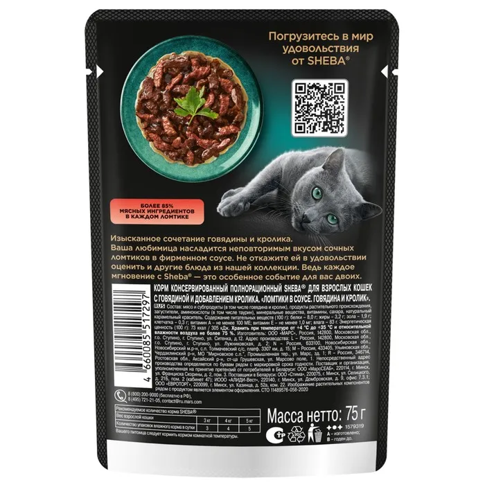 Ломтики с сочной говядиной и нежным кроликом в фирменном соусе - блюдо из высококачественных ингредиентов, которое придётся по вкусу самым притязательным кошкам. Мы приготовили его по особому рецепту, чтобы раскрыть всю красоту вкуса и сохранить баланс витаминов, минералов и аминокислот, необходимых вашей любимице. Подарите своей кошке особое удовольствие, побаловав ее всеми блюдами из коллекции SHEBA®.