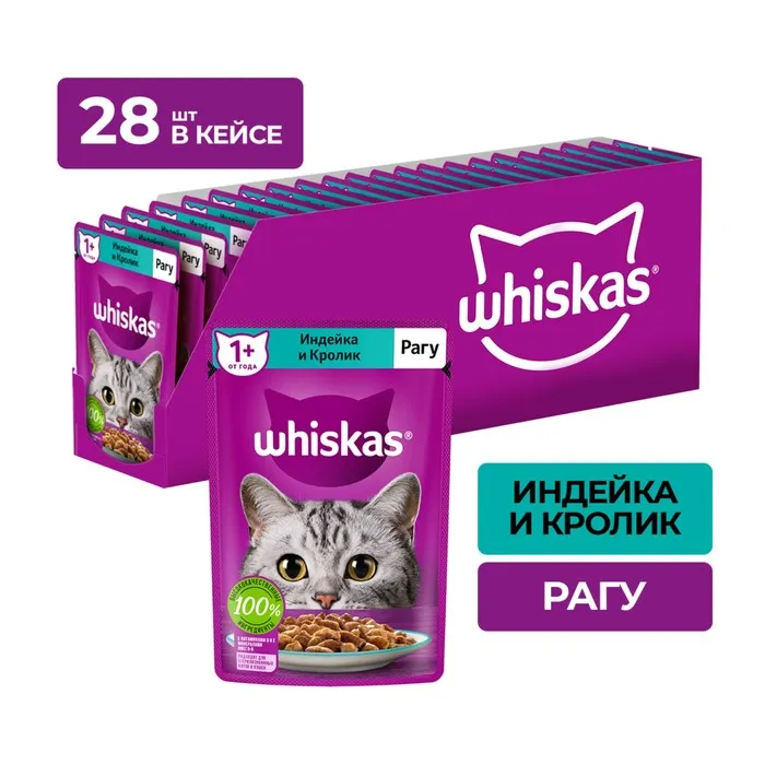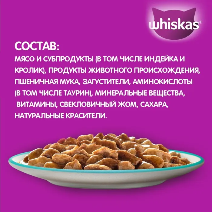 Это сбалансированный рацион, приготовленный так, как любит ваша кошка. Аппетитное рагу с индейкой и кроликом в густом соусе обязательно понравится вашей любимице. Жизнь замуррчательна, ведь рацион Whiskas® содержит все необходимое, чтобы еда вашей кошки была не только вкусной, но и полезной. Whiskas® поддержит иммунитет, позаботится о здоровом пищеварении и здоровье кожи и шерсти вашей кошки.