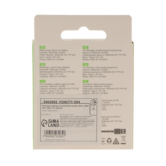 Внешний аккумулятор Borofone BJ31, 5000 мАч, USB/Type-C, 2 A, чёрный — Характеристики