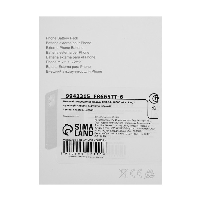 Внешний аккумулятор CRR-34, 10000 мАч, 5 W, для Iphone с функцией MagSafe, чёрный — Характеристики