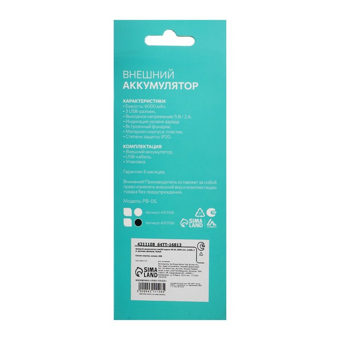 Внешний аккумулятор Luazon PB-05, 6000 мАч, 3хUSB, 2 А, дисплей, фонарик, белый — Характеристики