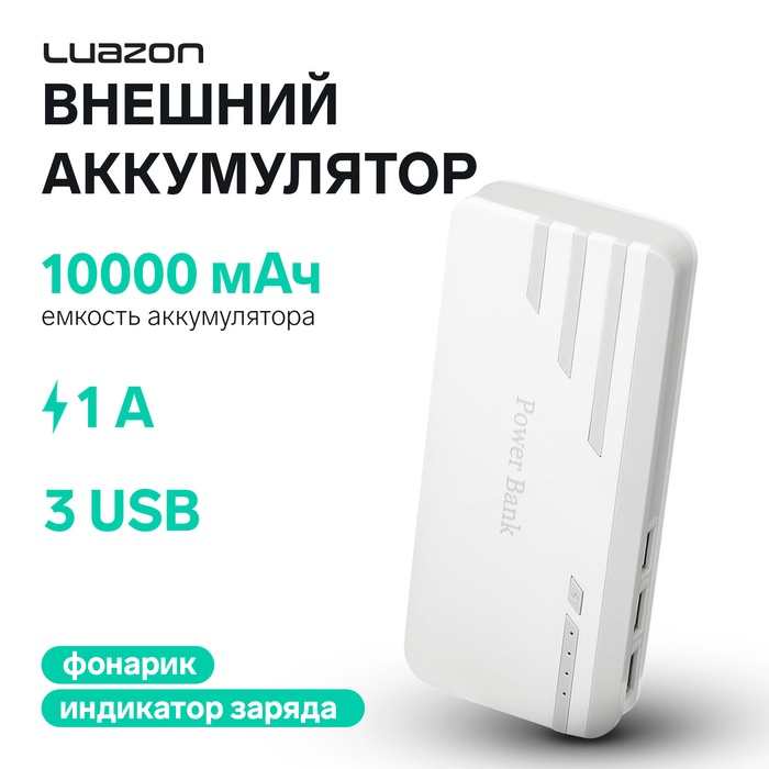 Внешний аккумулятор Luazon PB-25, 10000 мАч, 3 USB, 1 А, индикатор, фонарик, серо-белый