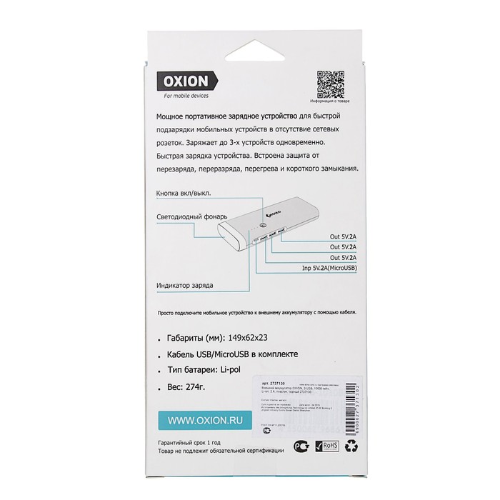 Внешний аккумулятор OXION, 3 USB, 10000 мАч, Li-ion, 2 A, пластик, черный — Характеристики