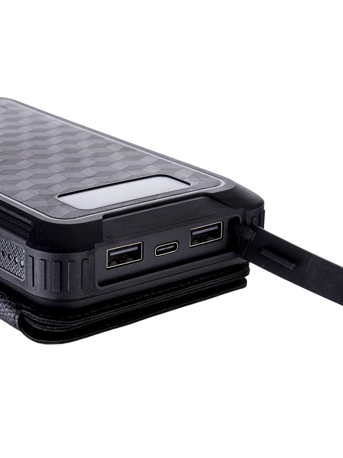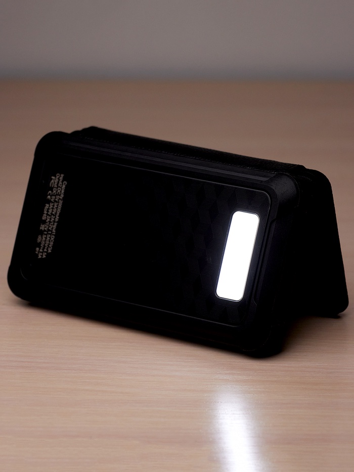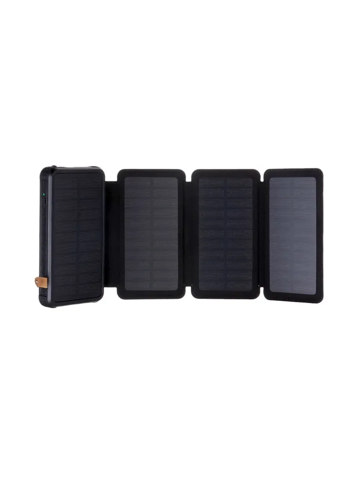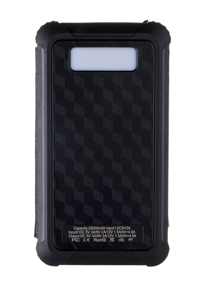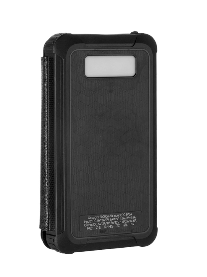 Мощный и надежный внешний аккумулятор емкостью 20000 мАч с максимальной мощностью 10 W. Универсальное решение для длительных поездок и путешествий. Складная солнечная панель позволяет подзарядить устройство на ходу, даже вдали от розеток. Настоящий черный стиль подойдет к любому вашему устройству.