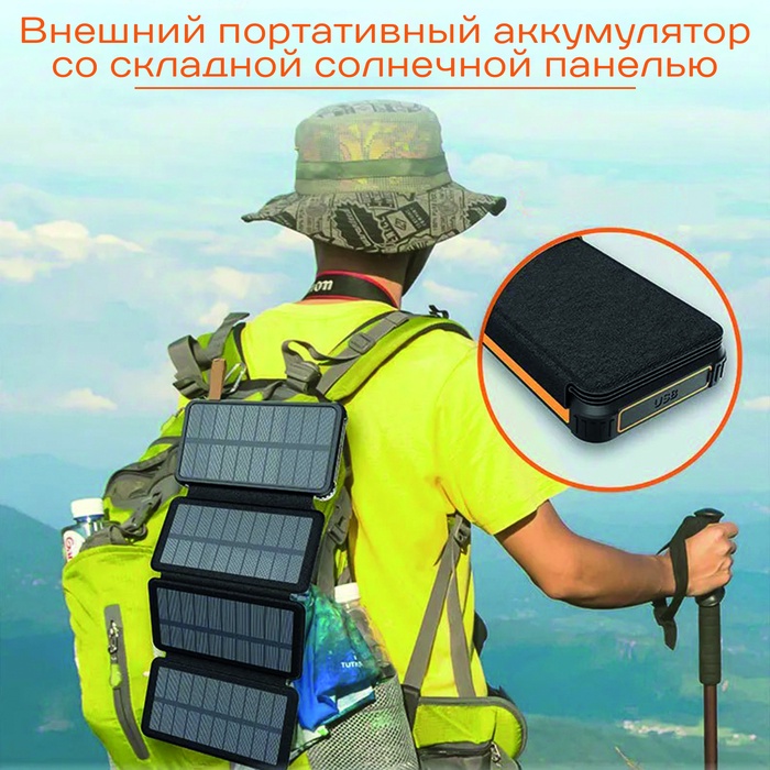 Внешний портативный аккумулятор 20000 мАч, 10 W, со складной солнечной панелью, чёрный — Характеристики
