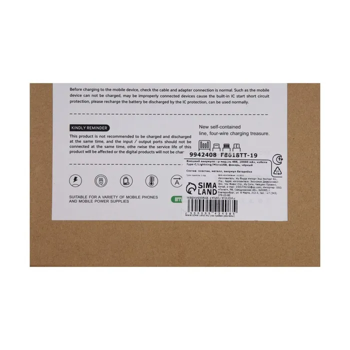 Внешний портативный аккумулятор 486, 20000 мАч, кабели Type-C/Lightning/MicroUSB, фонарь, чёрный — Характеристики