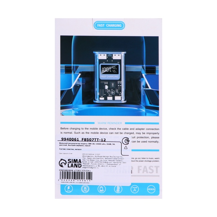 Внешний портативный аккумулятор CRR-28, 10000 мАч, 2USB, 3 А, с дисплеем, быстрая зарядка, серый — Характеристики