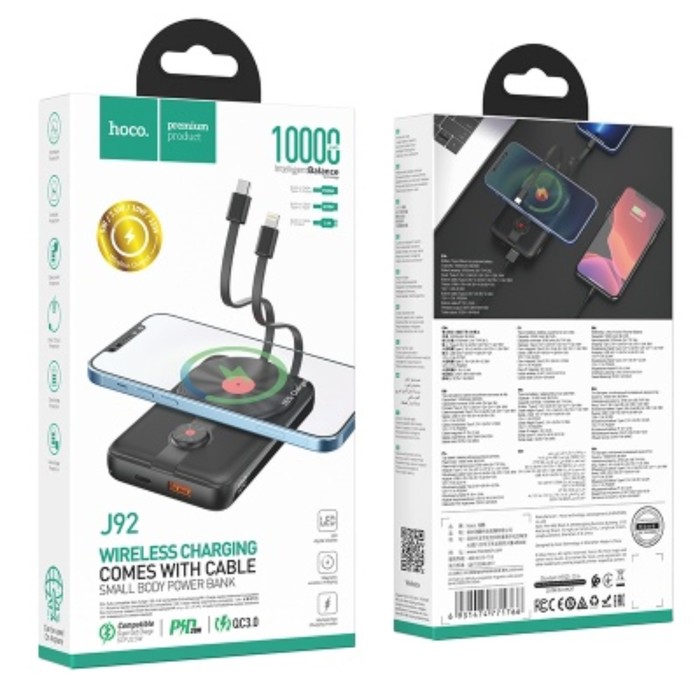 Внешний портативный аккумулятор Hoco J92, 10000 мАч, 3 А, с дисплеем, беспроводная зарядка, Type-C, Lightning, чёрный — Характеристики