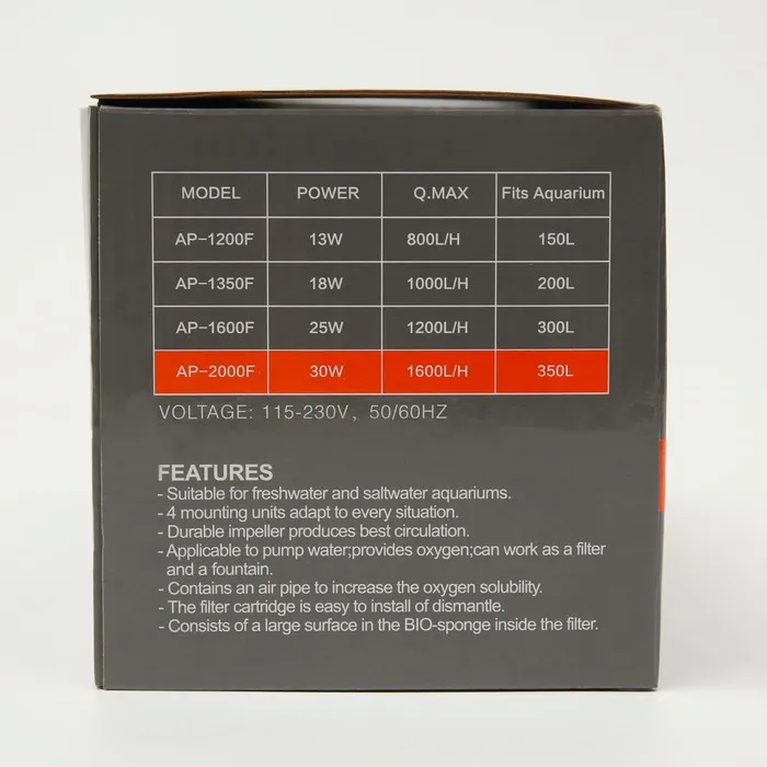 Внутренний фильтр Hidom AP-2000F - это мощный фильтр с производительностью 1600 л/ч и мощностью 30 Вт.