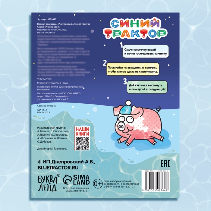 Водная раскраска «Рисуй водой» — увлекательная развивающая книга для малышей, которая объединяет творчество и игру. Вместо привычных карандашей или красок ребёнку потребуется только вода, чтобы картинки ожили яркими цветами. С героями из мультфильма «Синий трактор» процесс превращается в волшебное путешествие по страницам!