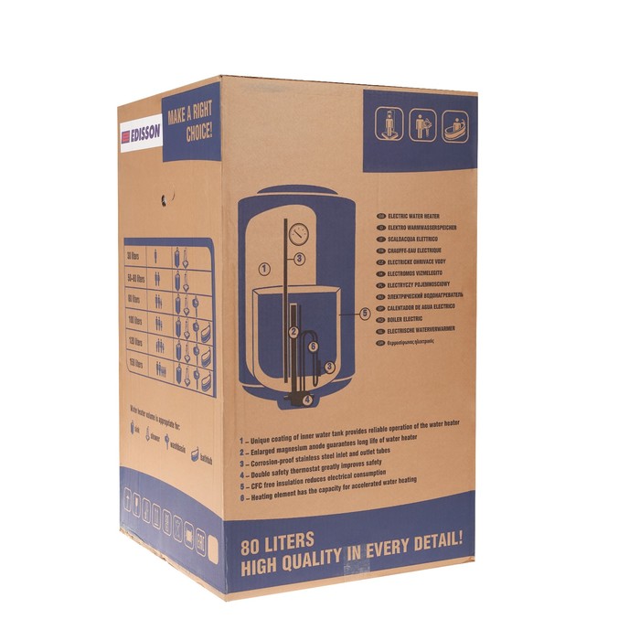 С водонагревателем EDISSON в доме всегда будет горячая вода. Такой агрегат сделает вас независимым от коммунальных служб. Данная модель органично впишется в интерьер благодаря классическому дизайну.