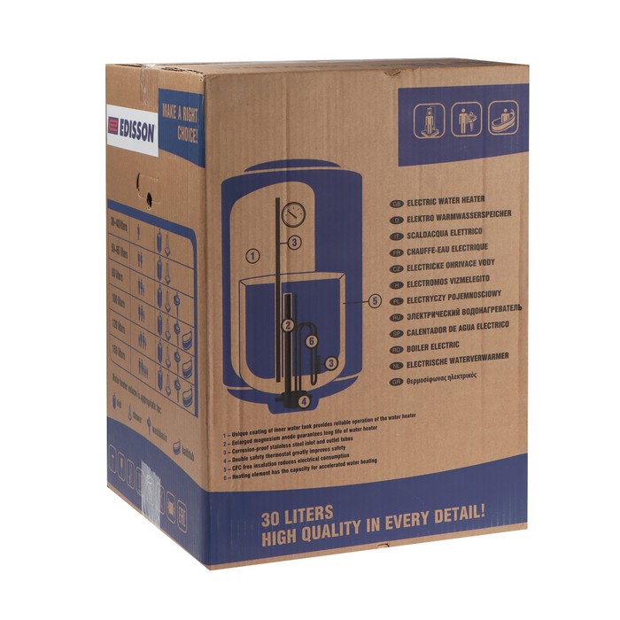 Водонагреватель EDISSON ES 30 V, накопительный, круглый, эмаль, 30 л, 1500 Вт — Характеристики
