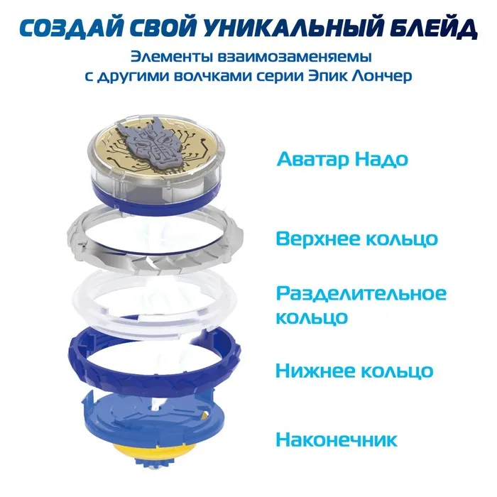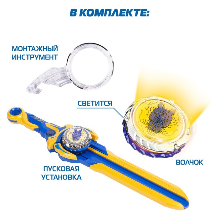 - Эффектный дизайн со светящимся элементом: волчок окрашен в жёлто-синие тона и оснащён системой подсветки. При вращении он создаёт яркие световые эффекты, усиливая зрелищность баттлов.