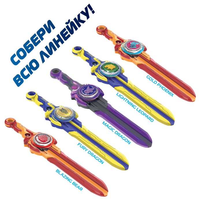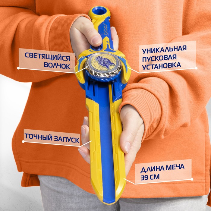 - Удобный меч-лаунчер для мощного запуска: устройство в форме меча помогает раскручивать волчок с нужной силой и точностью. Ребёнок учится контролировать технику броска для победы в схватках.