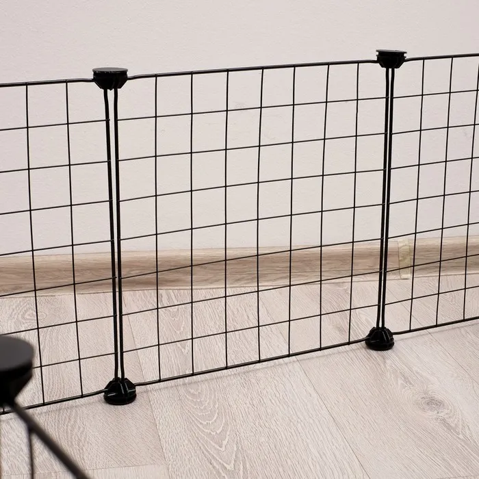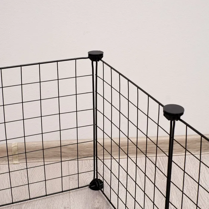 Вольер (клетка) сделан из негнущихся металлических секций, его можно быстро собрать и разобрать на открытом воздухе или в квартире без каких-либо дополнительных инструментов. Съемная конструкция складных перегородок разборного домика позволяет формировать квадратную, прямоугольную или любую неправильную форму.